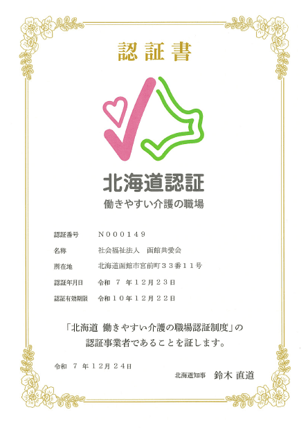 2026.02.18「北海道 働きやすい介護の職場認証制度」を取得いたしました